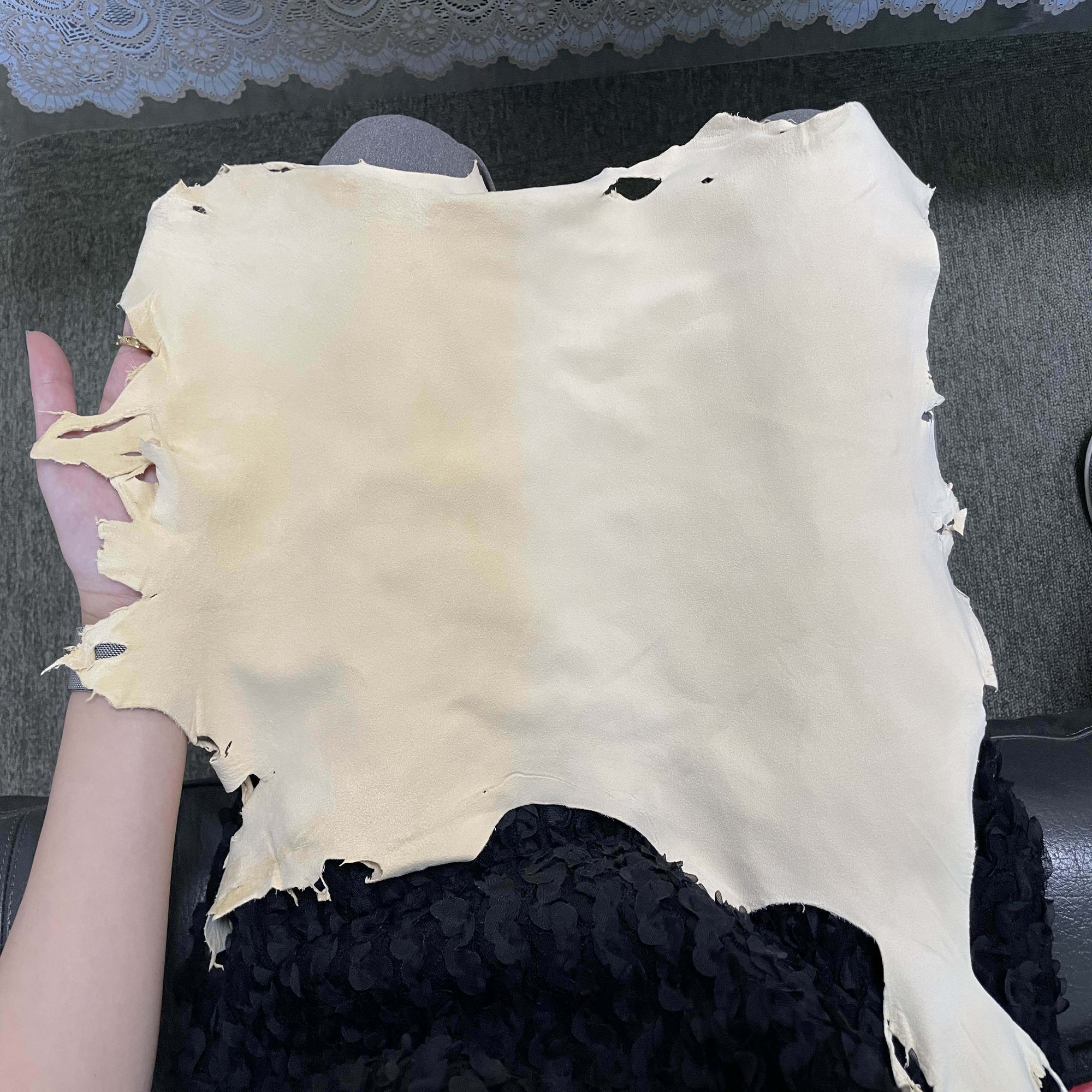 原皮の状態から鞣しを行い乾燥させます。このとき、革は白い色をしています。鱈油で二次鞣しまで行います。
