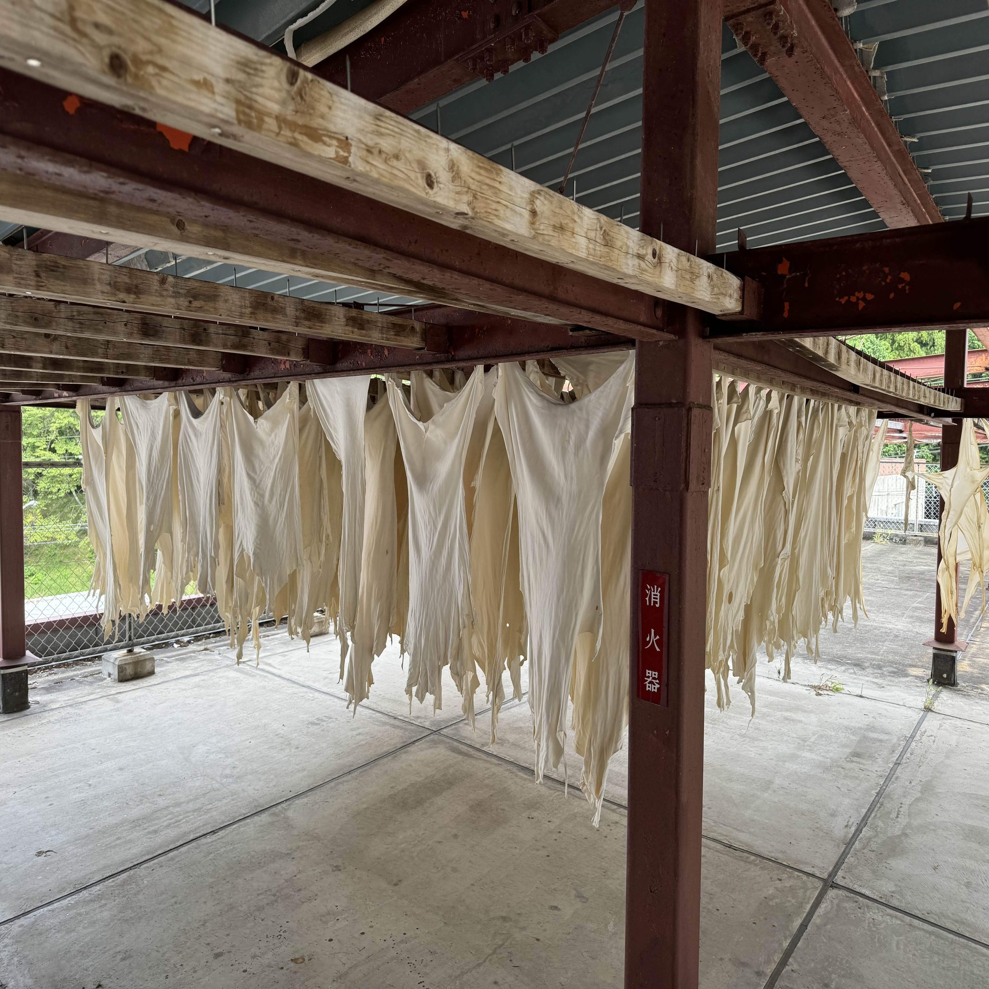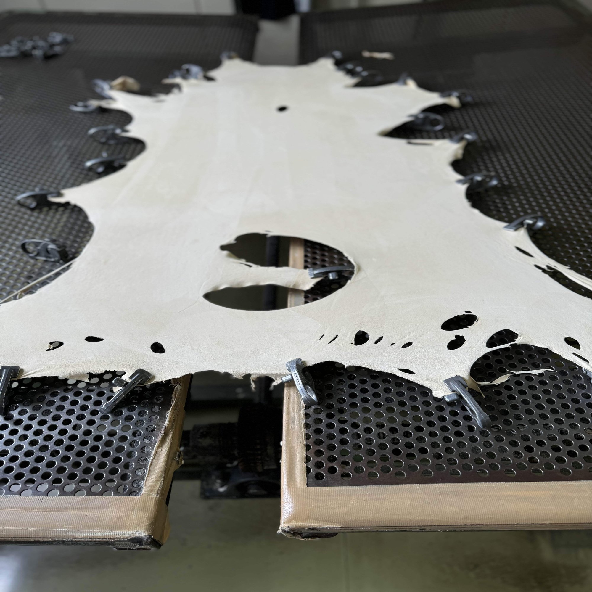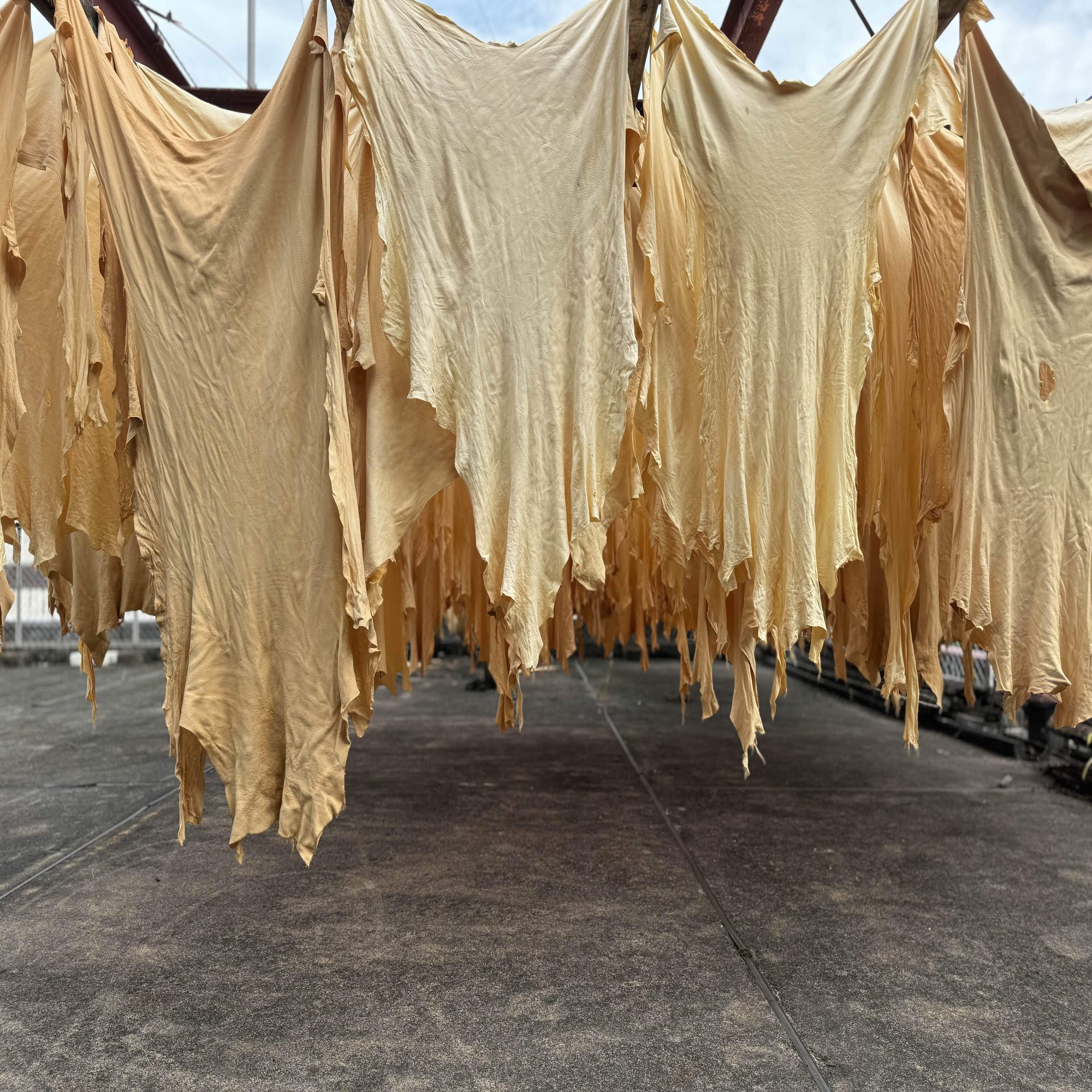革に油分を浸透させるため、約3週間ほど乾燥させます。最初は白かった革がだんだん黄味っぽい色になり、セーム革の色に変化していきます。
