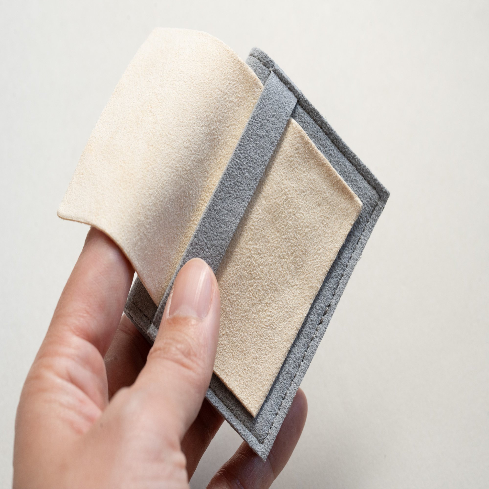 前者は純鹿セーム革、後者は贅沢にキョンレザーでご用意させていただきます。拭きやすいよう、そしてさまざまな用途でお使いいただけるようロゴなどの刻印はしておりません。